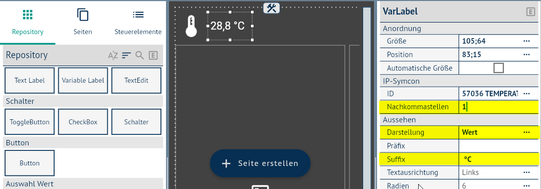 IPSView bietet für diese Variable ein Label an, platzieren Sie das Steuerelement durch "Drag & Drop" auf der Zeichenfläche und setzen Sie die IP-Symcon ID der Variable. Alternativ können Sie natürlich auch die Suche im Repository verwenden und nach der betreffenden Variable suchen, in diesem Fall ist die Variable bereits gesetzt.