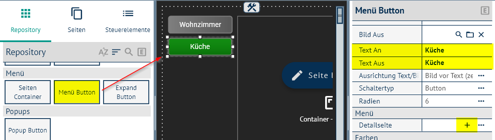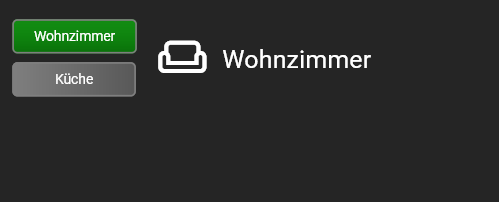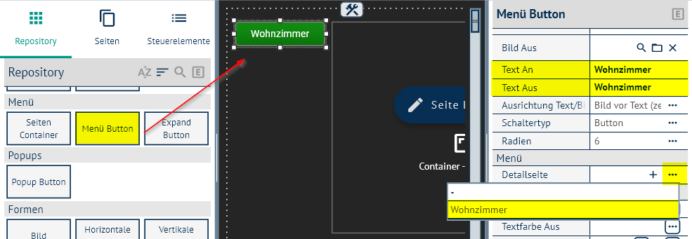 Fügen Sie nun auf der linken Seite einen Menu-Button für die Anzeige des Raumes "Wohnzimmer" ein und wählen Sie als Detailseite "Wohnzimmer".