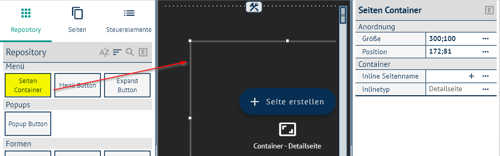 Der Objekttyp Seiten-Container stellt einen Container für andere Seiten (vom Type "Standard ) zur Verfügung. Im Zusammenspiel mit den Steuerelement Menu-Button kann der Inhalt des Containers durch eine andere Seite ausgetauscht werden. Auf diese Weise können beliebige Menü-Strukturen erstellt werden.