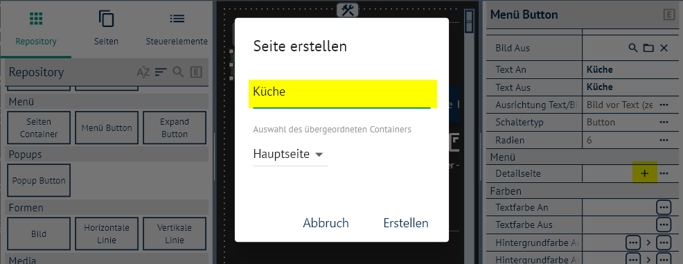 Auf die gleiche Weise erstellen Sie nun auch einen Menu-Button für den Raum "Küche" und betätigen Sie den Button "Seite erstellen" bei der Auswahl der Detailseite.