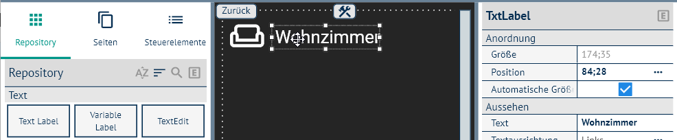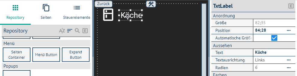 Die neue Standard Seite wird erstellt und Sie können Ihre gewünschten Steuerelemente auf der Seite platzieren. Nachdem Sie fertig sind, können Sie mit dem Button "Zurück" wieder auf Ihre Hauptseite navigieren.