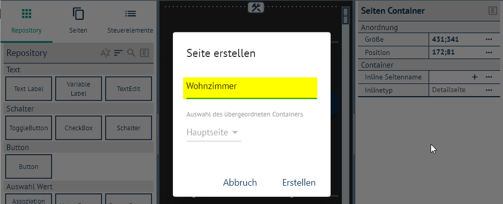 Der Dialog zum Erstellen einer Seite wird angezeigt. Geben Sie hier wieder Ihren gewünschten Seitennamen ein und bestätigen die Eingabe mit Erstellen.